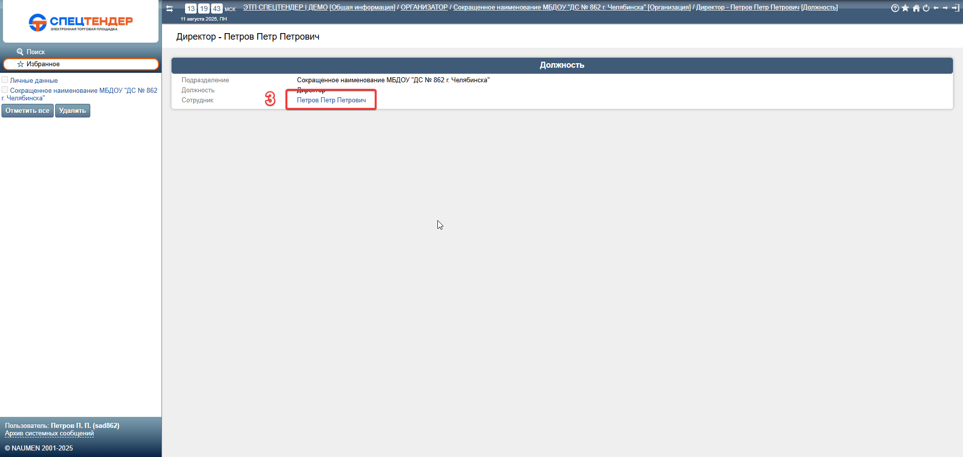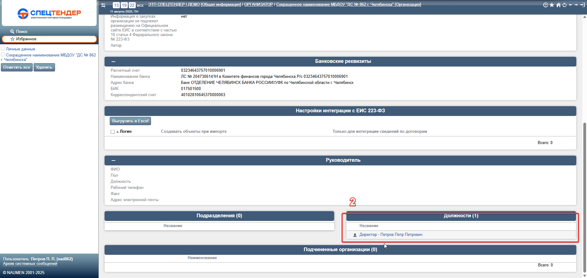 2. В разделе «Должности» (в нижней части страницы) выберите запись, соответствующую сотруднику, указанному при регистрации.