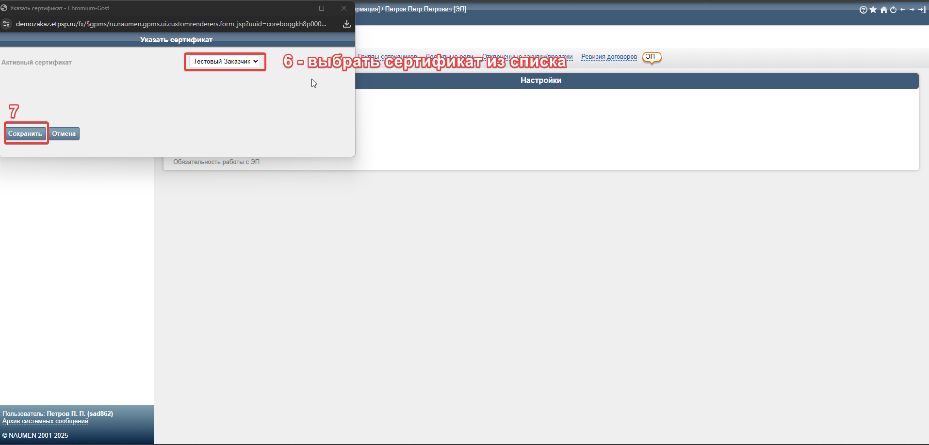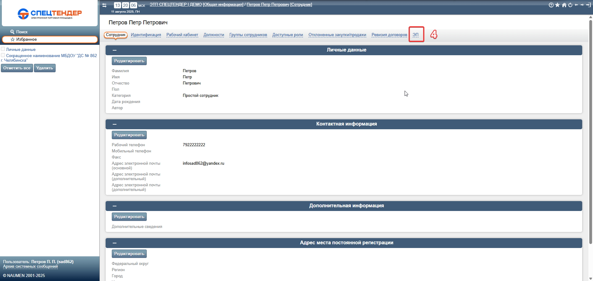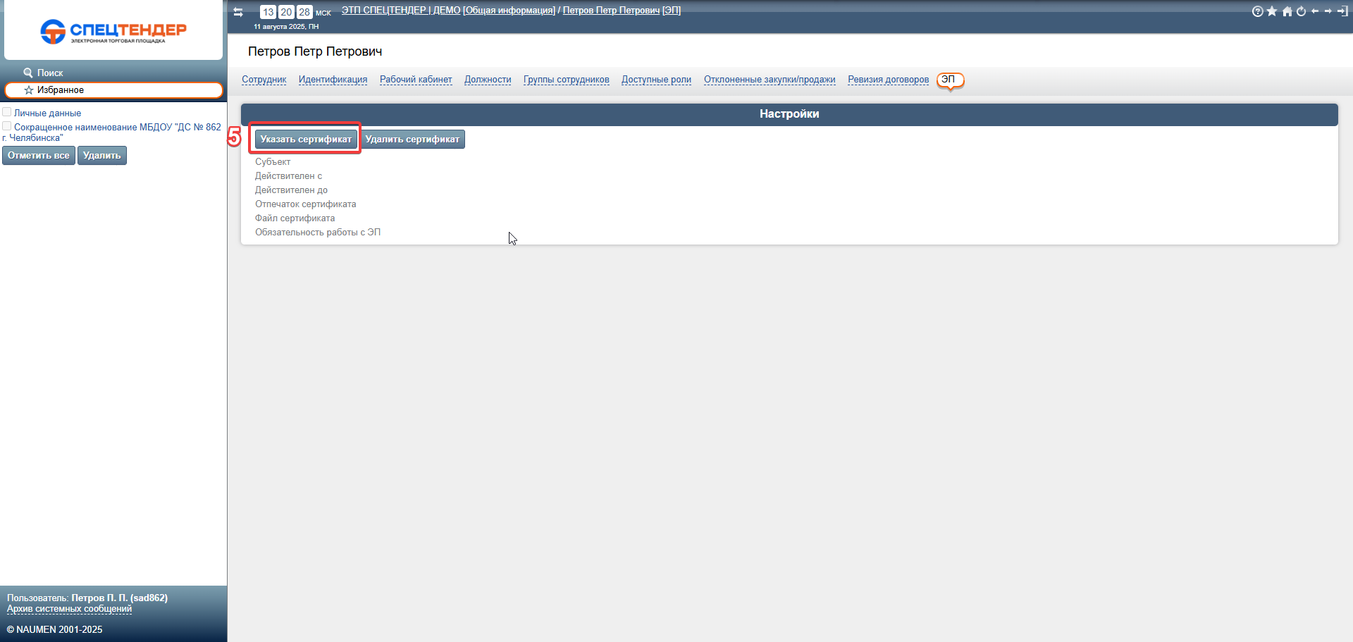 · После сохранения указанный сертификат будет привязан к сотруднику; вход в личный кабинет ЭТП станет возможен с использованием этой электронной подписи.