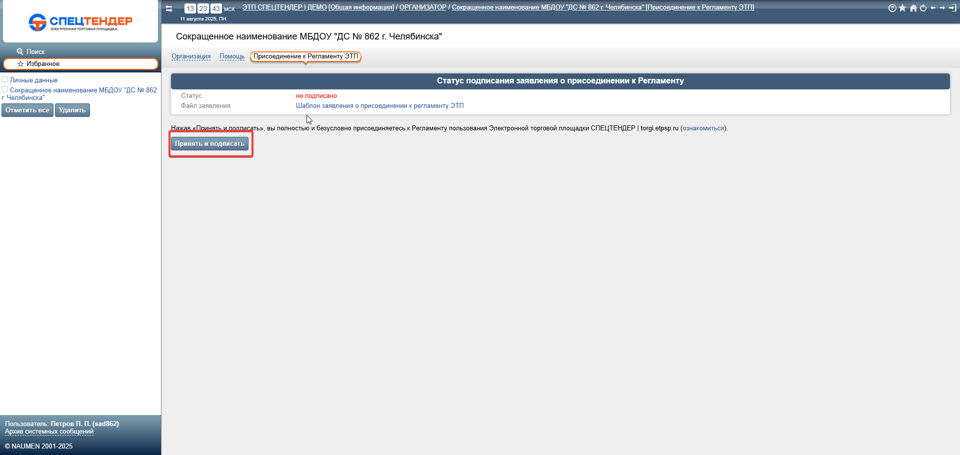 8. Перейдите на вкладку «Присоединение к регламенту ЭТП».