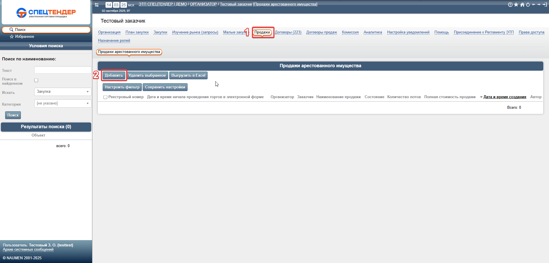 1. Для размещения продажи имущества необходимо перейти в раздел «Продажи».