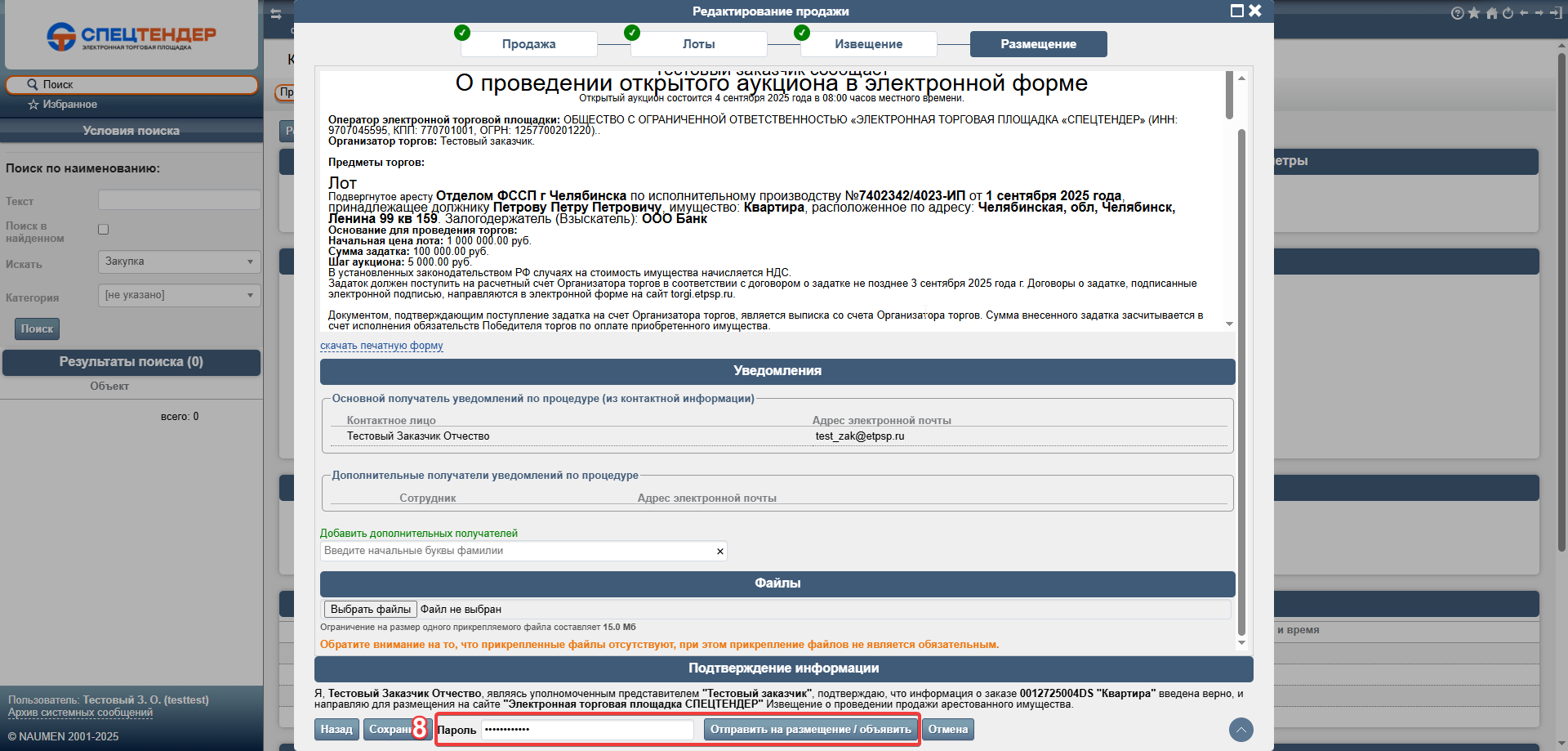 8. Впишите пароль от личного кабинета, и нажмите на кнопку «Отправить на размещение / объявить»