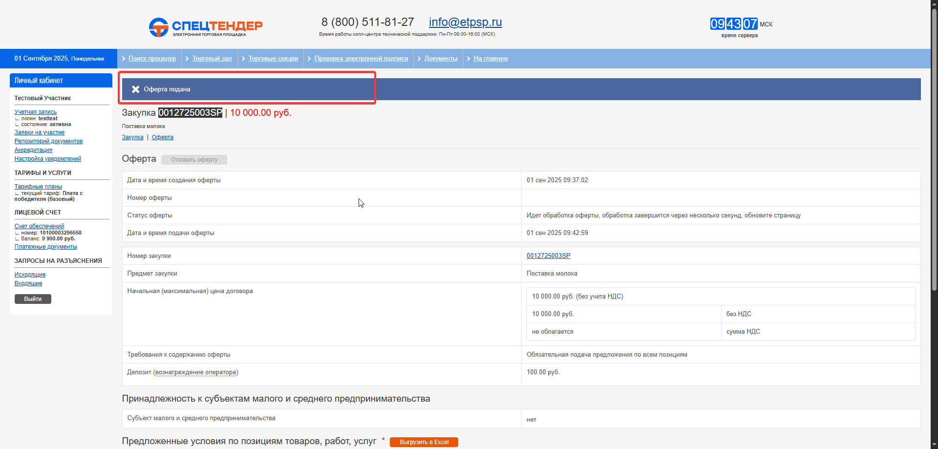 Дождитесь уведомления о успешной подаче оферты.