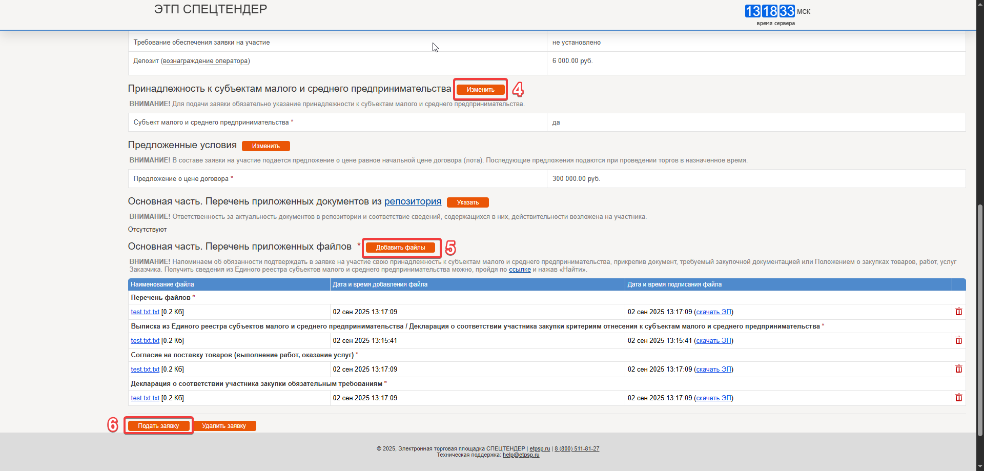 6. Проверьте корректность и полноту заполненных полей и приложенных файлов и нажмите «Подать заявку».
