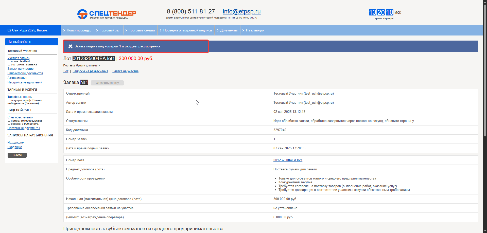 7. После успешной отправки вы увидите уведомление вида: «Заявка подана под номером № [номер заявки] и ожидает рассмотрения».